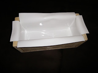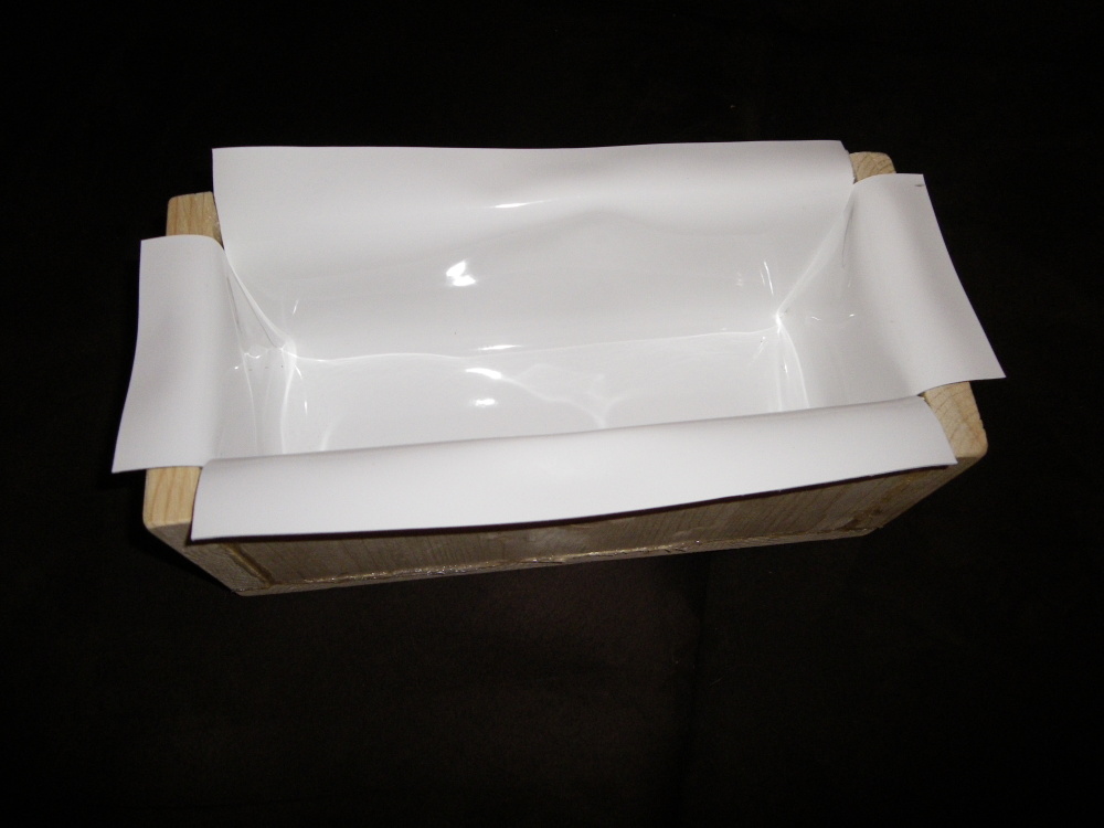 Forma: drevená, o rozmeroch 28cm x 10cm x 10cm, vyložená plastovo-textilnou fóliou (už ma zunovalo stále vykladať papierom na pečenie, tak som si vyrobila takú, čo sa dá používať dlhodobo).