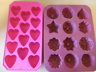 Takže som si pripravila malé formičky:- jednu na ľadové kocky v tvare srdiečok - veľmi pevnú, silikónovú, a jednu na mydlá - také malé kvietky, tiež silikónová, ale mäkkšia.