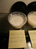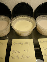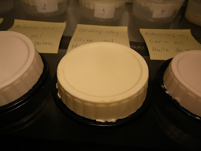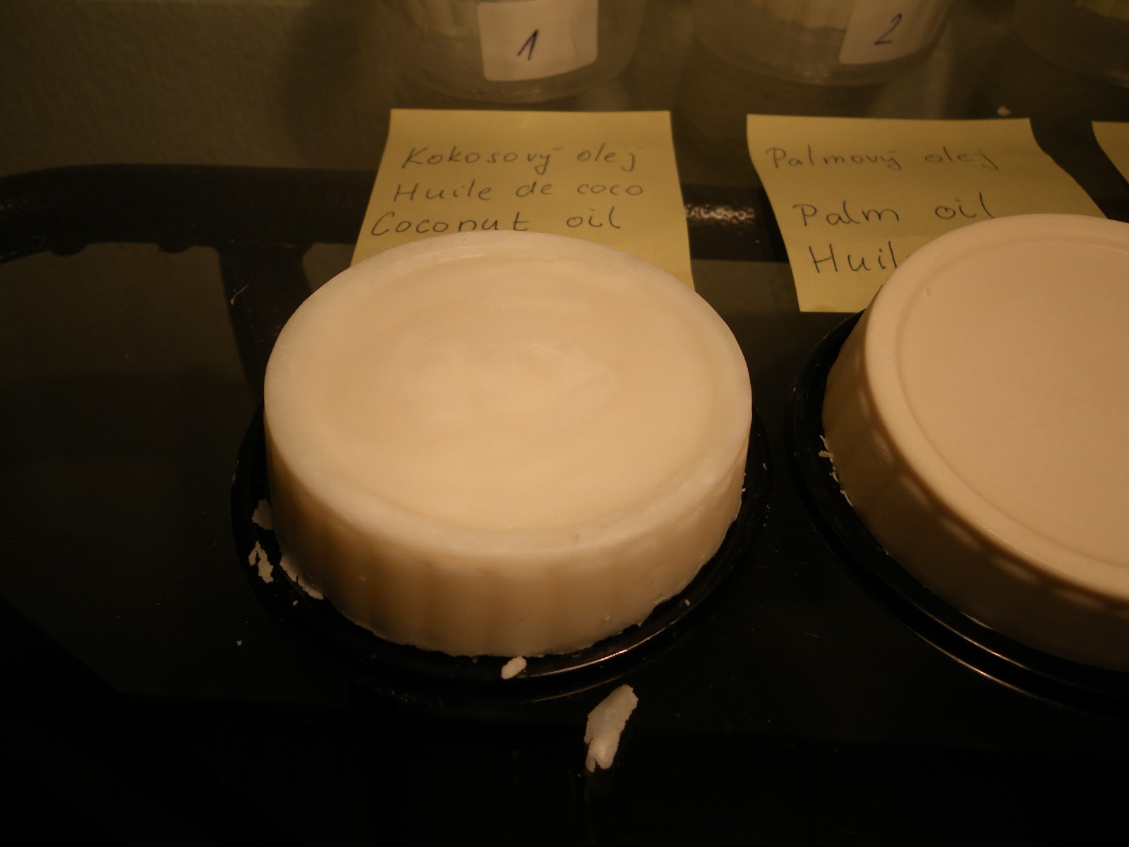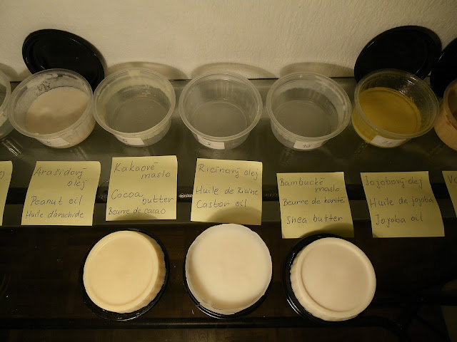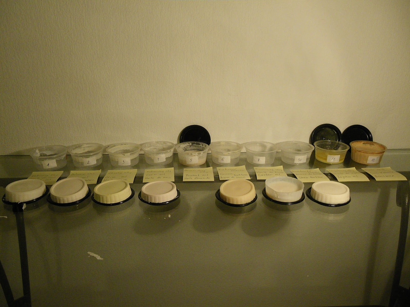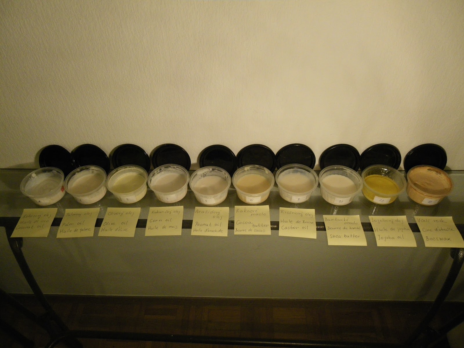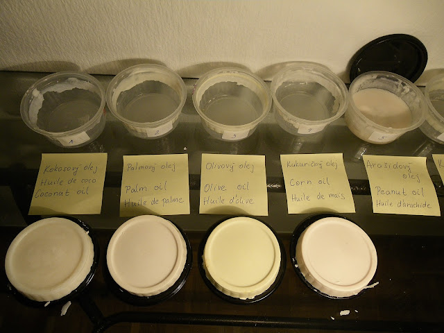 Hneď na začiatku sa priznám, že hoci som sa snažila všetky mydlá vyrobiť za rovnakých podmienok, aby som minimalizovala vplyv jednotlivých parametrov ako je napríklad teplota miešania tukov a roztoku hydroxidu, percento pretučnenia, prípadne počet šálok vypitej kávy pred miešaním, podarilo sa mi hneď na začiatku spraviť hlúpu chybu v meraní NaOH, takže prvé mydlá v poradí nemali plánované 5% pretučnenie. Ale aspoň som sa z toho poučila, ale popíšem neskôr....