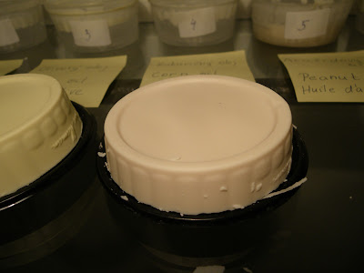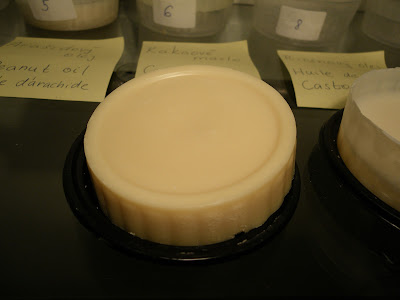 Najmäkkšie mydlo bolo arašidové, najtvrdšie bolo z kakaového masla. Ricínový olej dal mydlo trochu translucentné, čo je presne podľa očakávaní.