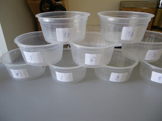 Kelímky som si označila číslami, aby som vedela o ktorý sa jedná. Nepoužila som meno oleja, čo sa ukázalo ako praktické, pretože som potom zistila, že niektoré oleje nemám, takže som nemusela nič prepisovať.Pretože sa jedná o malé množstvá olejov a malé formy, ktoré rýchlo strácajú teplo, snažila som sa dodržať vyššiu teplotu olejov a NaOH pri zmydelnení, v knižke Susan Miller Cavitch - The Soapmaker's companion - odporúča 47°C.