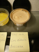 Ricínový olej, bambucké maslo a palmový olej a včelí vosk stačilo vymiešať ručne. Stopa nasledovala najrýchlejšie u ricínového oleja a bambuckého masla, mydlo z palmového oleja hustlo menej rýchlo, zato spoľahlivo. Včelí vosk bola kapitola sama o sebe, okamžite nasiaklo všetku vodu s NaOH a premenilo sa na veľmi suchú a drobivú hmotu. Ochladenie a stuhnutie vosku som sa snažila minimalizovať práve vysokou teplotou oboch zložiek pri miešaní, ale zrejme to nestačilo. Potom som čítala, že dobrý postup je zmydeľňovať včelí vosk stále vo vodnom kúpeli až do stopy, aby sa udržal tekutý stav. Prečo by niekto zmydelňoval včelí vosk, keď mydlo zo 100% včelieho vosku nepení? To je zas iný príbeh, ku ktorému sa dostanem v niektorom z ďalších príspevkov.