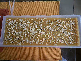 6) Nalejte do foriem, posypte dekoratívne celými ovsenými vločkami, nezakryte a pre istotu dajte do chladničky - zabránite tak prehriatiu, a možno aj gélovej fáze, ktorá nie je na škodu, ale ak chcete čo najbelšie mydlo, tak je nežiadúca.