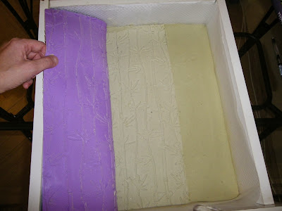 0. Najprv som si pripravila formu - drevotrieskový šuflík (s tenkým dnom) som vyložila plastovou fóliou a potom som ju vyložila silikónovou podložkou s bambusovým vzorom. Podložka bola širšia než šuflík, tak som ju potom použila na prikrytie mydla aj zvrchu.