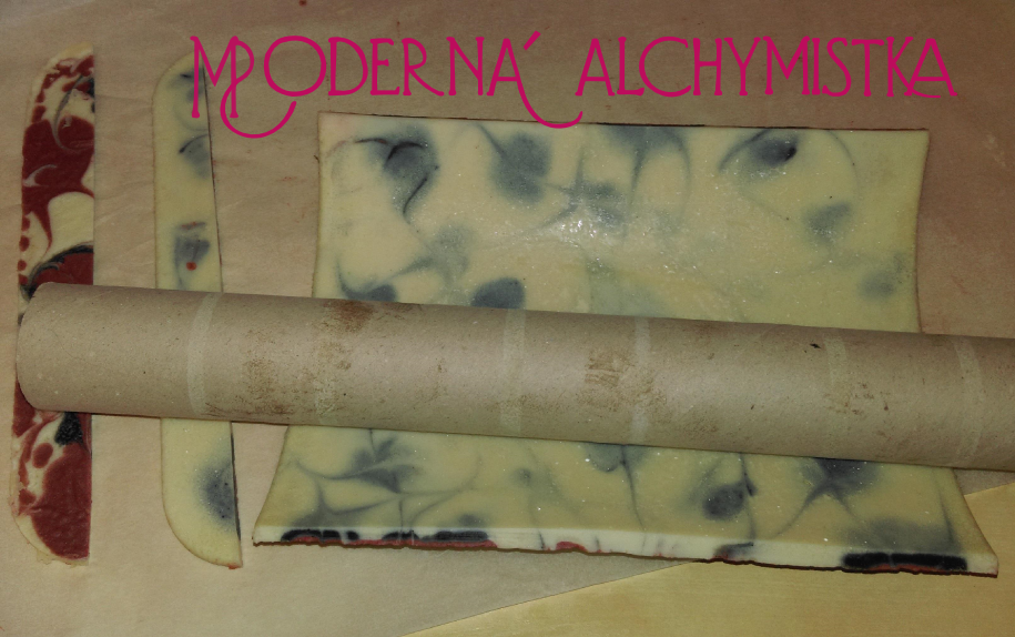 Mydlo sa dalo ohýbať pekne, takže som odkrojila okraje... lenže potom som zistila, že sa mi nedarí ho ohnúť viac, a keď som použila užší valec z papiera, začalo praskať. 5mm hrúbka je naozaj priveľa pre takú úzku formu....