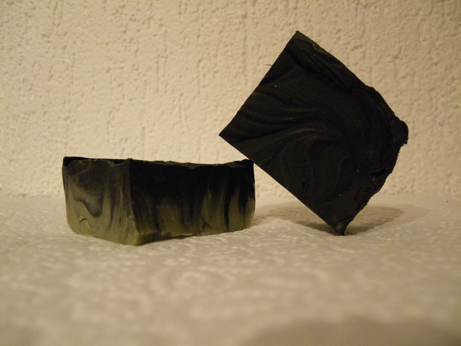 Roztok NaOH s vodou a aloe vera mal najprv tmavšiu, skoro jantárovú farbu, potom farba trochu vybledla, roztok však ostal nažltnutý. Mydlo veľmi rýchlo získalo stopu, takže som ho do formy vylievala v krémovitej podobe. Po pridaní zeleného ílu sa mydlo sfarbilo do zelena. Do polovice zeleného mydla som pridala asi jeden a pol čajovej lyžice čierneho uhlia. Túto druhú časť som potom naliala na zelenú časť a niekoľkokrát v rôznych smeroch prešla opačným koncom čajovej lyžice, snažiac sa vytvoriť vzor.